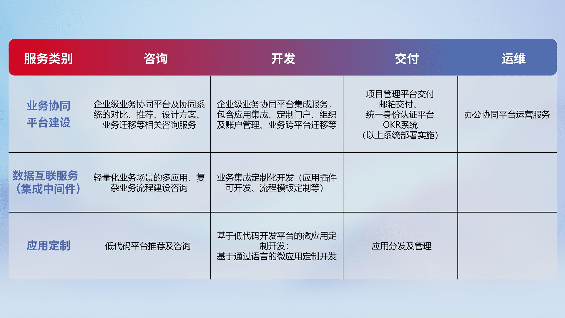 针对钉钉、、企微、、IDaas等平台级产品提供产品的规划、、、方案、、、、交付、、定制化开发等服务,,实现如统一协同办公、、、智能客户服务、、混合会议管理、、、智能数据查询、、等业务场景,,,实现数字化转型。。。
